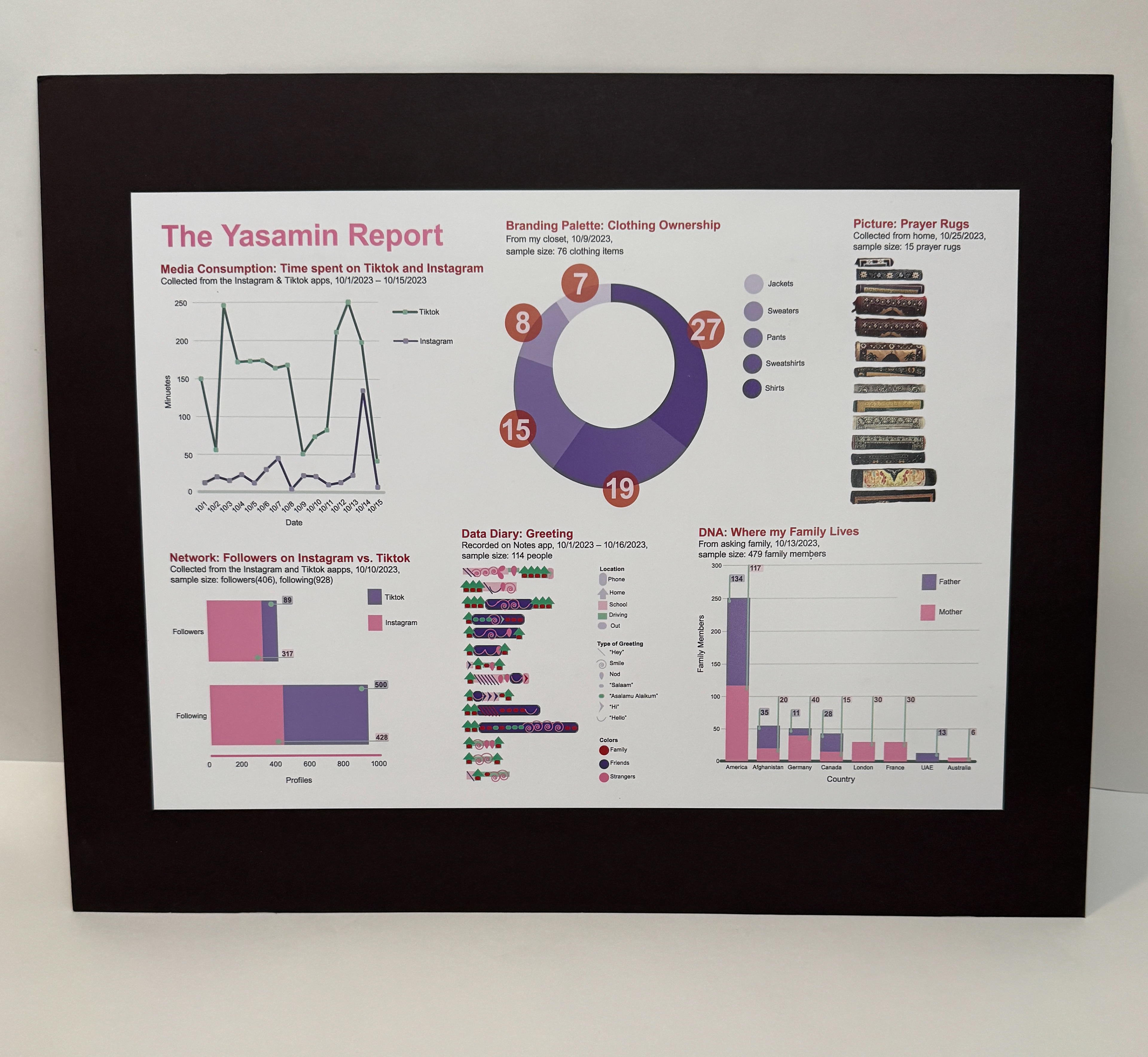 Trajectory of just a glimpse of my life. Data plays a really important role in everyones life, and in terms of design, thinking about color, placements and different graphs to showcase you. Data can show us how much we can see by collecting and putting together things and by putting it together we can see who we are. Made on Illustrator.